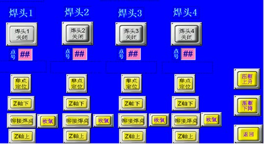 4頭超聲波焊機用于汽車內飾焊接上,有4個獨立的焊頭,每個焊頭上有X、Y、Z三個運動軸。主要有回零、示教、焊點定位、及焊點測試等功能,設有焊頭防撞保護、光柵保護、伺服報警保護,設備暫停等保護功能。設備如圖一所示: